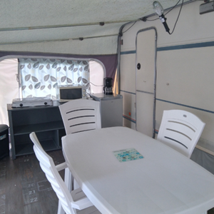 En el interior encontrará una zona de comedor convertible en cama doble, así como una cama comedor, perfecta para niños o amigos. La cocina está equipada con todo lo necesario para preparar tus comidas: frigorífico, fogones, microondas y utensilios de cocina.
